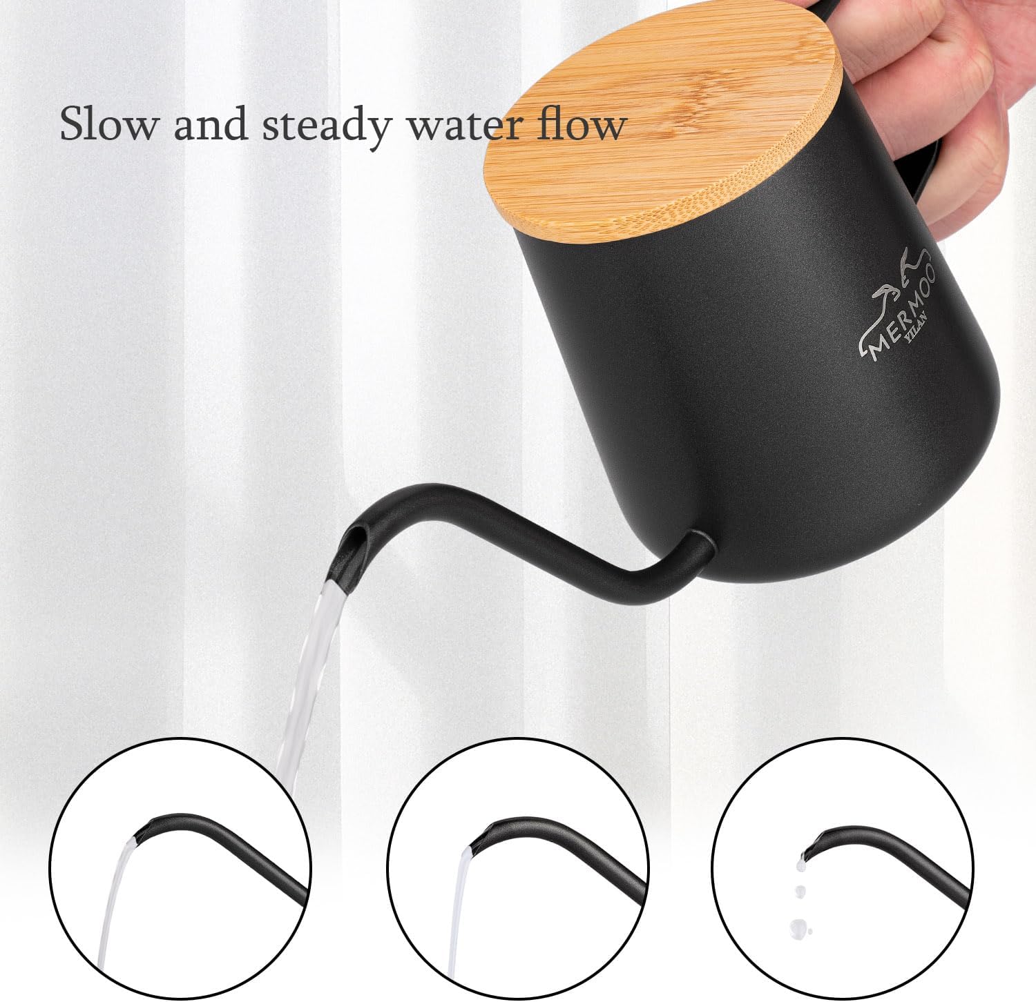 The MERMOO YILAN gooseneck kettle is perfect for coffee and tea enthusiasts who seek precision and style in their beverage preparation. With a capacity of 350 ml, this elegant kettle is made of food-grade 304 stainless steel, ensuring durability, corrosion resistance, and easy cleaning.