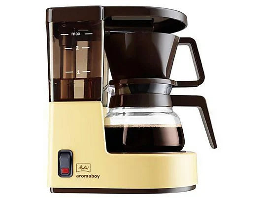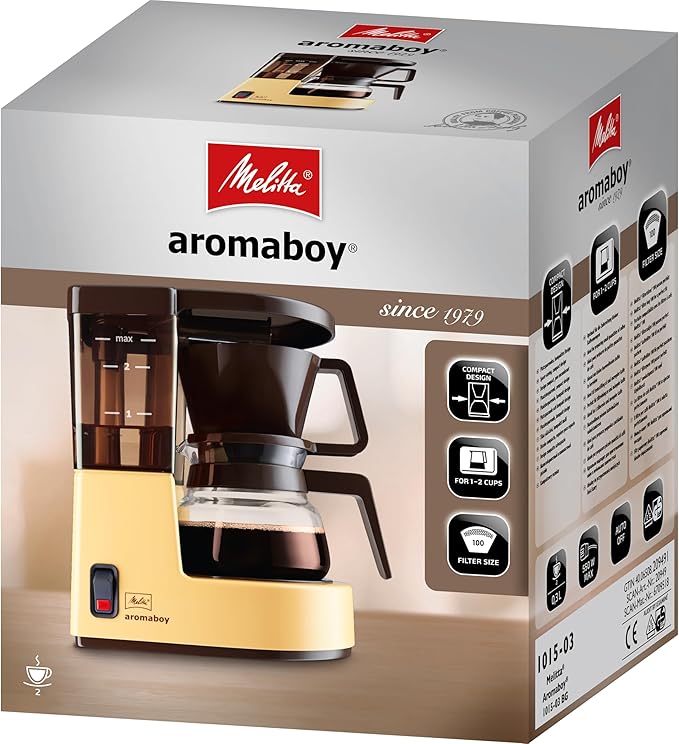 Diseño Retro y Compacto Con su diseño en tonos beige y marrón, la Melitta Aromaboy aporta un toque vintage a cualquier cocina, ocupando muy poco espacio gracias a su tamaño compacto. Ideal para apartamentos pequeños, oficinas o incluso como una cafetera adicional para ocasiones especiales.